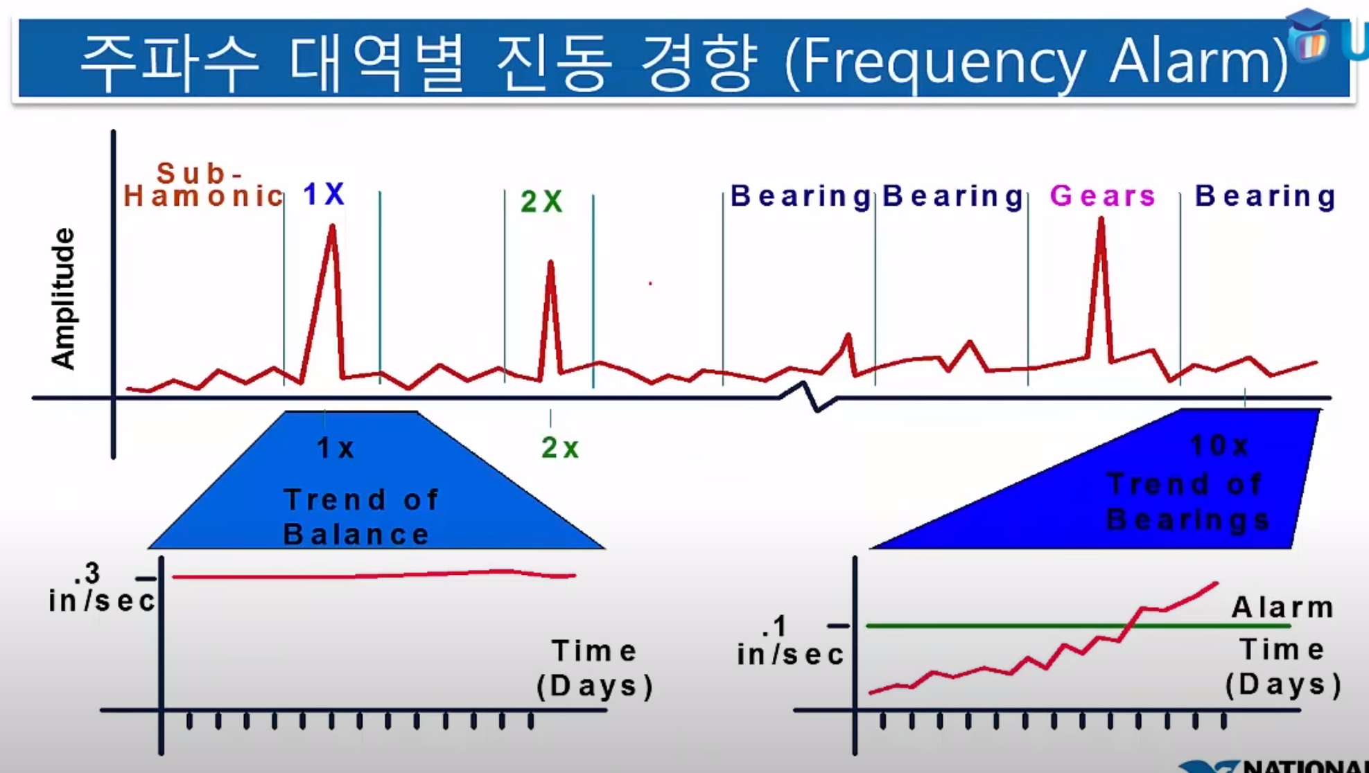 주파수 대역별로 진동 경향이 있음. 이런 것들을 따로 모니터링하면 아래 2번째 그래프 우측처럼 오르내리는 부분을 확인할 수 있다. 이렇게 분석해서 상태가 나쁠 때 해당 파라미터를 확인하면 이후 정확한 고장 시점을 예측할 수 있다.