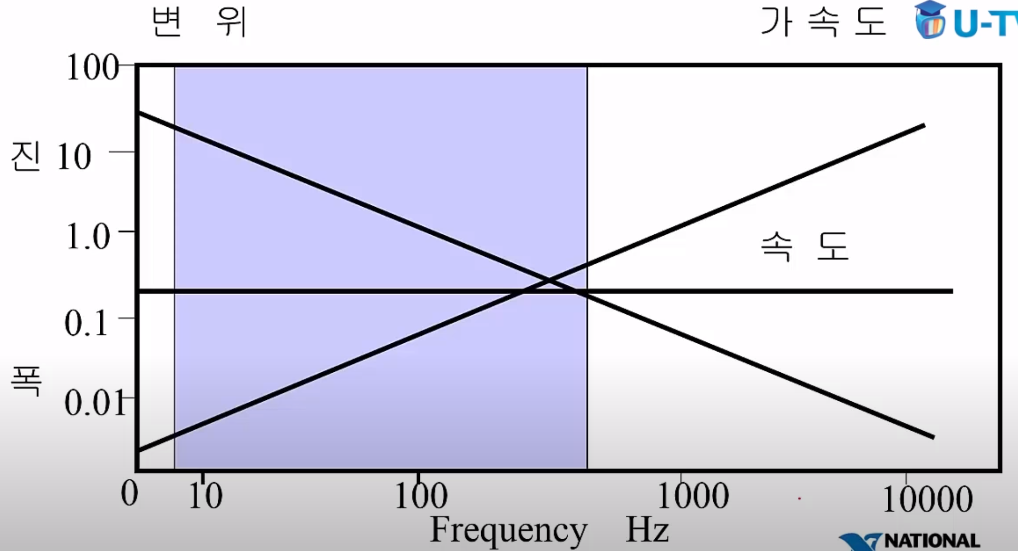 고주파로 갈 수록 가속도가 더 잘 보인다. 그리고 저주파에선 변위가 잘 보인다. 이것이 진동을 서로 다른 단위로 쓰는 이유이다.
