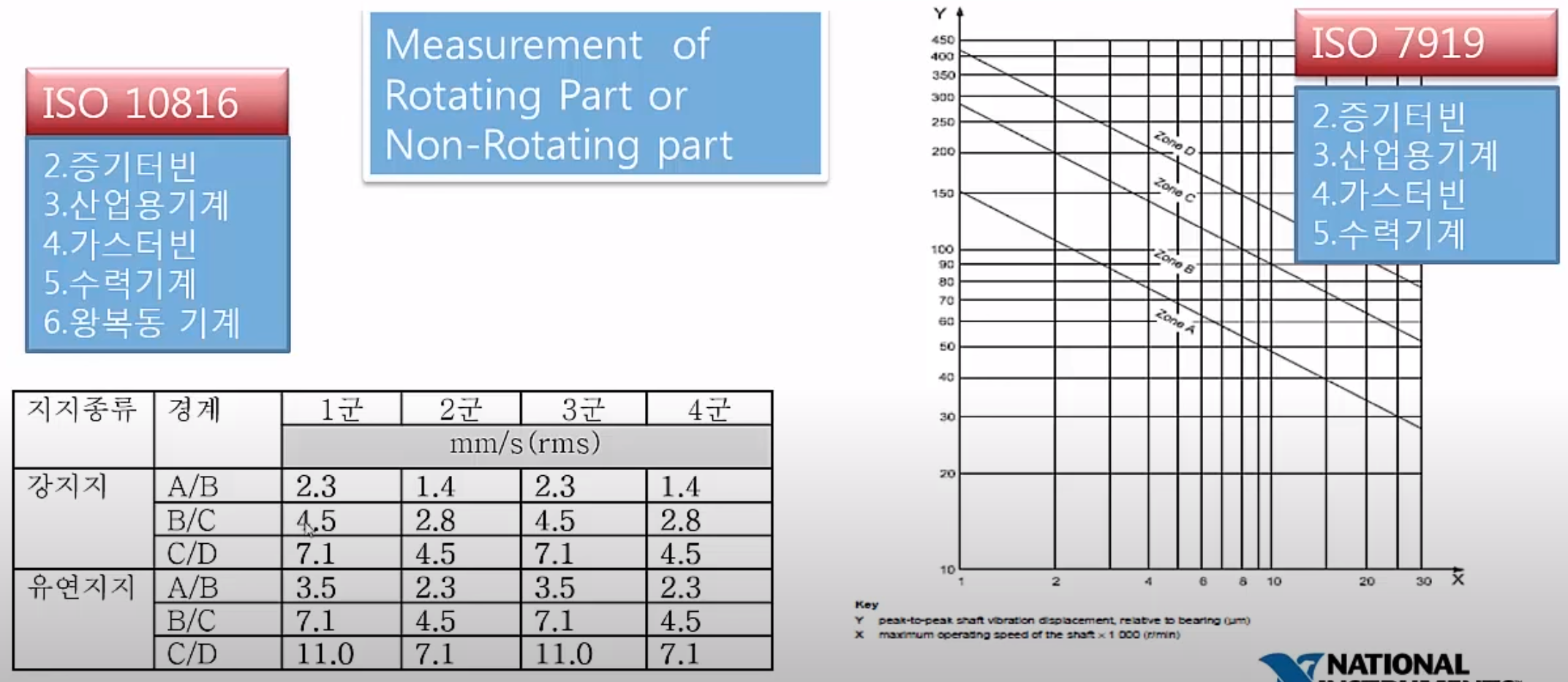 진동으로 장비 진단을 하기 좋은 점 중 하나가 이미 진동에 따른 평가제도가 구축되어 있다는 점이다. ISO 10816과 ISO 7919에 따르면 진동의 정도에 따라 장비의 등급을 분류해낼 수 있다.