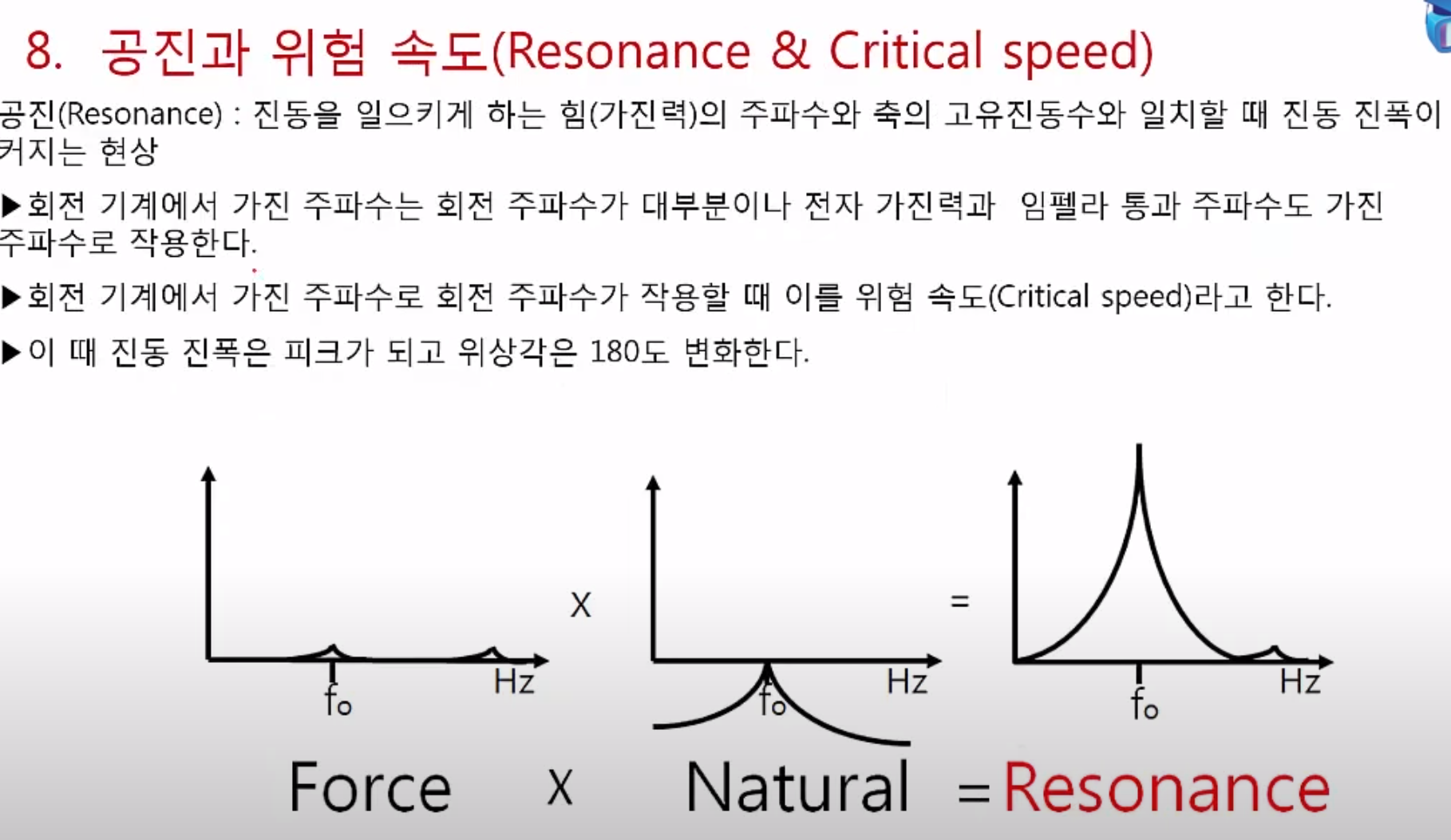 8. 가중 주파수(force)가 움직이면 밑에 숨어있던 고유주파수(Natural)를 건드려서 그 부분만 진동이 크게 생긴다. 이런 것은 설계상에서 감안해야 될 부분. 실제로는 현장에서도 어느 정도 튜닝이 필요하다.